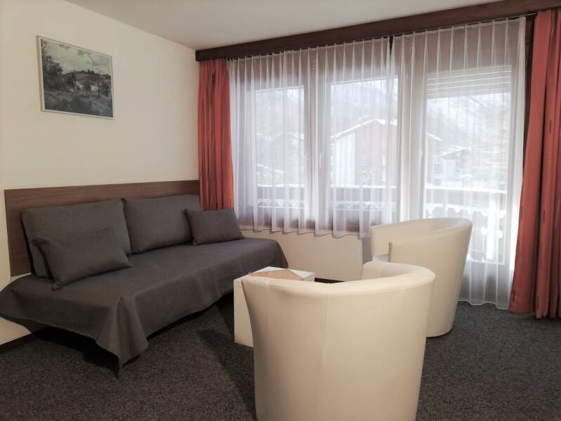 Very nice 3.5 room apartment (60 m2) on the 1st floor, 2 double bedrooms, 1 living room with 1 bed, flat screen with cable TV, radio, free WiFi, modern bathroom with shower/ WC and hairdryer, open kitchen with dishwasher, oven, ceramic stove, Fridge with freezer, kettle, dining area, south and west-facing balcony with free views of the mountains and glaciers. Included in the price: Heated ski and boot room near the cable cars. Cable cars and post bus in summer with the SaastalCard free of charge (without metro and summer ski), stop for the ski bus next to the house (free).